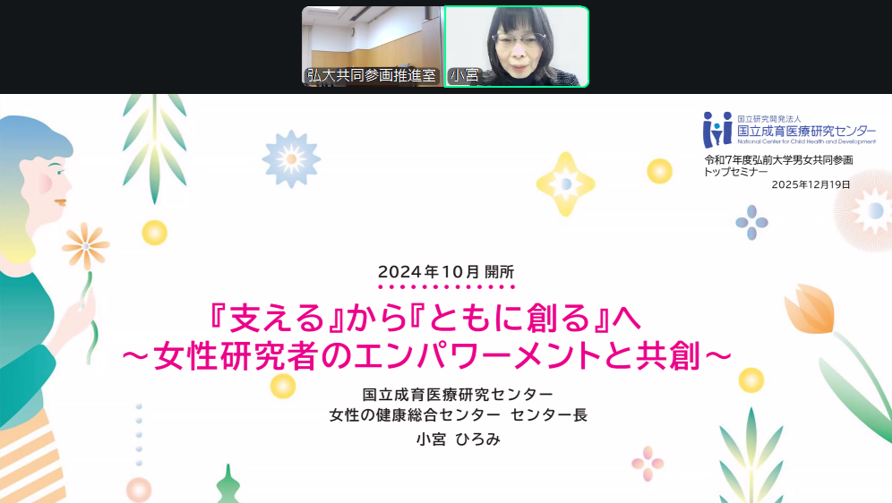 12月19日、弘前大学創立50周年記念会館2F岩木ホールおよびZoomで「令和7年度弘前大学男女共同参画トップセミナー」が開催され、本学の役職員や「北東北国立3大学連携推進会議連携協議会」の参加機関の教職員約60名にご参加いただきました。